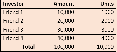 Let us understand NAV through an example: Assume a pool of money from 4 friends, each friend putting in different amounts of money. MF issues Rs.10/- notional value Units to the 4 investors