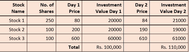 Mutual Fund invests this money in shares of 3 companies and see how their investment value change from Rs. 1 Lakh on Day 1 to Rs. 1.1 Lakh on Day 2: