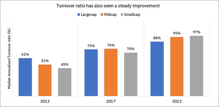 The turnover ratio has steadily improved across the board over the last 10 years, indicating that there is now ample liquidity in all sections of the market. This is a stark improvement from 2012, when the turnover ratio of Smallcaps was below 50% and Midcaps were barely above 50%. The turnover ratio now stands nearly at or above 90% for the typical Largecap, Midcap, and Smallcap stocks.