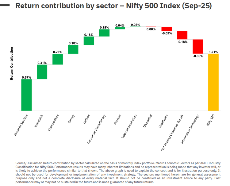 - Nifty 500 delivered 1.21% in September; Financial Services added 0.67% to returns, while IT subtracted 0.30%to the index.
